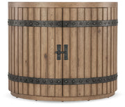 Designed in a half-circle shape inspired by a wine barrel, the Vineyard Row Demilune Nightstand is crafted of Pecky Hickory Veneers finished in the light and airy Sonoma and accented by rustic hammered metal and interlocking pulls. The two doors have soft-close hinges and magnetic door catches. Two adjustable wood shelves.