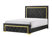 This bedroom collection offers a sophisticated palette, presenting a refined look that's both modern and timeless. The bed anchors the set with its plush, button-tufted headboard framed by a bold, gold accent trim, creating a luxurious focal point. The matching dresser, chest, and nightstand feature sleek, black surfaces complemented by gold hardware, adding a touch of elegance. Each piece stands on neat gold-finished legs, lifting the furniture off the ground and enhancing the feeling of spaciousness. The dresser's large mirror reflects light and adds depth, making it as functional as it is stylish.