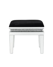 Shining in the Hollywood glamour style, the Lotus Vanity Stool will be an ultimate statement piece for your dreamy dressing room. Mirrored tapered legs and aprons are characterized by reflective surface, with decorative faux crystals enhancing its modern design. The vanity offers a soft padded seat in rich black flannel, adding tempting textures to your space. Feel like a star with this fabulously glam stool.