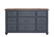 The Americana Dresser boasts a refreshing coastal twist on traditional style. Skillfully crafted from Rubberwood Solids and Birch Veneers, the subtle distressing Corduroy Blue finish and Antique Pewter hardware give this Dresser an updated look with a timeless heirloom feel. Featuring nine soft-close drawers, felt lined top drawer and felt lined jewelry insert, this Dresser will provide ample storage space for clothing and accessories. Just like Baseball, Apple Pie and Rock & Roll, the Americana Sofa Table will become a beloved favorite in your home. Fully assembled upon arrival, this piece from Bridgevine Home is ready to unbox and enjoy.