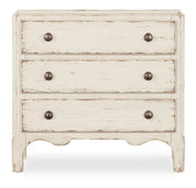 In a classic, charming design with a nostalgic flair, the Americana Three-Drawer Nightstand is crafted of Oak Veneers with a Solid-Wood Edge Top, a scalloped-shape base and finished in the deep tone. There are 3 self-closing drawers, with the interiors finished in the warm color. Metal alloy knob pulls in an antique finish.