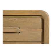 The Lennon nightstand is a sleek nod to Mid-Century storage. Its rounded corners and inset handle underscore a look that is clean and captivating, while its two spacious drawers provide ample storage. Crafted from timeless mango wood and finished in vintage brown, this nightstand seamlessly blends rustic allure with contemporary design.