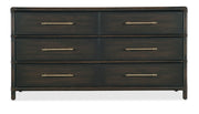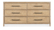 Inspired by tropical getaways, the Retreat Pole Rattan Dresser is a blend of natural materials in a laid-back, versatile design. Crafted of Oak and Maple Veneers with Rope accents, the dresser is finished in Sand, transparent by design to reveal the unique grain patterns in the wood veneer. Offering six self-closing drawers, the top left drawer has a removable felt liner and the top right drawer has a removable felt liner. The bottom two drawers are cedar-lined. The textured, pewter-colored bar pulls add a look of natural elegance.