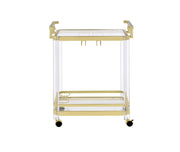 Modern meets function with the Aerin Serving Cart. Bold acrylic, tempered glass and chrome combine to create a focal point when serving your guests. Features include two shelves for serving and display, casters for ease of movement, stemware storage under top shelf and a three ring wine bottle holder on bottom shelf. So simple, yet so functional! Your purchase includes one serving cart.