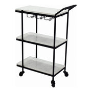 The Midnight bar cart is guaranteed to be a hit at your next hosting occasion. This dining room showstopper has a traditional style with a touch of retro glamor. Featuring three white marble shelves housed within an iron frame, this cart allows you to store your favorite drinks, glassware and cocktail accessories, and to serve your guests in style.
