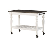 Classic farmhouse styling updated for today's dining. Turned legs and pilasters combine with cup pulls to create a look that is both new and vintage. The Joanna Server Cart is both stylish and functional with hooks for hanging, handles for towels and for use as a push bar and slatted bottom shelf for additional storage. A two-tone ivory and mocha finish complements many decors