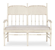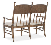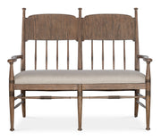 Celebrating the natural beauty of a simpler time, the inviting Americana Dining Bench has a nostalgic design including a spindle-style back with carved accents on the spindles and frame. The fabric seat is upholstered in the linen Biscuit performance fabric with welt trim. Crafted of Oak Veneers, the bench is finished in the Molasses finish, with the look of pieces passed down through the family over time and revealing the rich oak character beneath.