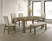 Warm and inviting, this dining group brings a natural charm to the home with its rustic wood tones and clean, understated lines. The rectangular table features a subtly rounded edge and a durable, plank-style top that extends to accommodate extra guests, making it ideal for both everyday dining and special gatherings. Upholstered chairs and bench offer padded seating in a soft, neutral fabric that enhances comfort while complementing the warm wood finish. The design balances casual elegance with practical versatility, creating a welcoming atmosphere perfect for modern family living.