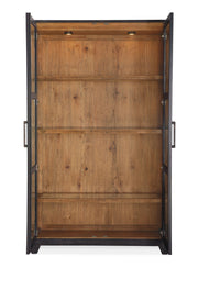 Vintage and rustic, the Big Sky Cabinet has a bold and simple design featuring seeded antique glass doors with a diamond-and-cross-beam pattern decorative overlay. The Charred Timber finish on the exterior contrasts with a Vintage Natural finish on the interior that reveals the authentic knots and wood grain of the Pecky Hickory Veneers. The doors have soft-close hinges, and behind them are two adjustable wood-framed glass shelves with a plate groove and one fixed wood-framed glass shelf in the center with a plate groove. The two lights have a 3-intensity touch switch on the right pack panel.