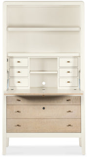 Contrasting a serene Almond White finish with Maple and Figured Maple Veneers on the drop-down front and drawer fronts, the Hera Hub gets you organized and keeps clutter out of sight. Perfect for the kitchen, bedroom, loft or living space, it has one adjustable wood shelf in the top section and one fixed wood shelf in the top section. The drop-front writing surface opens to reveal 6 small drawers and one adjustable wood shelf. There’s a cutout in the back panel for wire management and two bottom drawers underneath the drop-front area. The top drawer has a cream-colored removable felt-lined tray, and the bottom drawer has a lock and two compartments. The right compartment has hanging file storage. The left compartment has a removable tray.