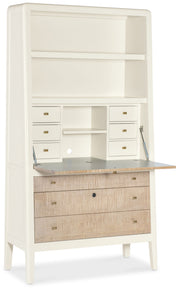 - Drop-front writing surface with 6 small drawers and one adjustable wood shelf