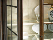 A stunning focal point piece, the Leesburg Display Cabinet has beautiful arched fretwork in the glass doors and a contrasting antique white finish on the back panel and 3 adjustable shelves. Two interior can lights are activated by a touch switch. Column motifs and a rich traditional mahogany finish with elegant cathedral and swirl mahogany veneers with light physical distressing create classic style with a fashionable flair.
