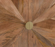 The Neskowin Hall Cabinet features natural mango wood offset grain patterns separated by brass finished metal inlays. Circular brass finished metal hardware matches the base. Soft close door hinges open to the cabinet to reveal one fixed shelf.