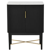 The Vida Black Wine Cabinet with Marble Top exudes art deco flair and old Hollywood glamor, offering elegant dining room storage. Its reeded black-finished doors with gently curved corners bring a refined touch to this functional piece. Inside, adjustable wine rack shelves hold up to 12 bottles for a stunning display, while hanging stemware storage adds to its charm. The sleek black finish, brass hardware, and luxurious marble top come together to create a chic storage solution that elevates any dining space with style and sophistication.