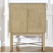 The Vida Wine Cabinet with Marble Top exudes art deco flair and old Hollywood glamor, offering elegant dining room storage. Its reeded burnished blonde-finished doors with gently curved corners add a refined touch to this functional piece. Inside, adjustable wine rack shelves hold up to 12 bottles for a stunning display, while hanging stemware storage enhances its charm. The warm burnished blonde finish, brass hardware, and luxurious marble top come together to create a chic storage solution that elevates any dining space with timeless style and sophistication.