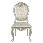 Add traditional glamour to your dining space with the Devayne side chairs. They are as comfortable as they are beautiful with their foam padded seats and backrest. Upholstered in sumptuous jacquard fabric for an added stylish touch. Floral moldings are present on the top of the backrests and on the legs and apron, nailhead trim is the perfect finish touch to these chairs.