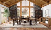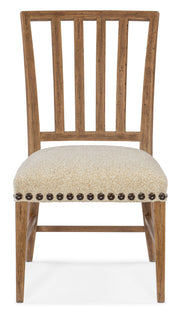 Inspired by the natural beauty of the American wilderness, the Big Sky Side Chair has a stylized spindle back, shaped wood legs and 3 stretchers finished in Vintage. The seat is covered in the Saxony Porcelain performance fabric, and oversized nailhead trim adds flair.