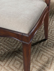 Timeless, warm and inviting, the Charleston Side Chair with an upholstered seat is the essence of gracious living. The chair has a wood splatback and fretwork design with a rolled claw arm and scalloped apron. The vibrant Black Cherry finish has an heirloom patina with subtle distressing. The seat is upholstered in a sand-colored fabric.
