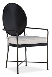 Welcome your guests with this iconic, industrial luxe Ciao Bella Metal Arm Chair with a romantic French attitude. The metal frame is finished in an Aged Bronze, and the removeable, reversible Tuscan White seat cushion is button tufted on one side with French primitive tufting on the other for comfort.