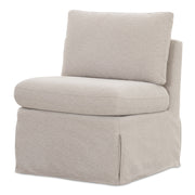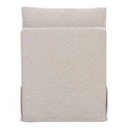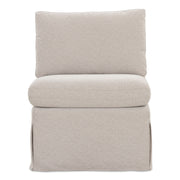 The Fable slipcover dining slipper chair's snug-fitting, washable slipcover with inverted pleats offers a tidy appearance and effortless upkeep. A slight tilt encourages a relaxed seating posture with a pillow back and seat cushions for comfort. Designed to be modular, it includes alligator clips to connect with other pieces in the collection, adapting seamlessly to various dining table sizes.