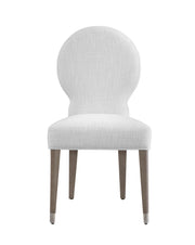 The Farrah Dining Chair features transition styling with a rounded seat back and tapered legs and brushed nickel ferrules. This chair is constructed with a solid hardwood frame, high density foam, and a linen-like porcelain performance fabric.