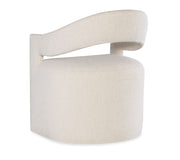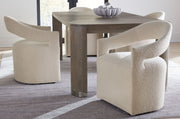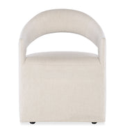 Cozy chic is married to a clean modern profile with the Modern Mood Upholstered Arm Chair, featuring a comfortable fully upholstered seat and arms with a rounded open back. The versatile chair moves easily from place to place on casters and is upholstered in the Inverness Natural boucle fabric.