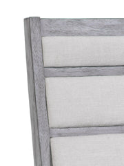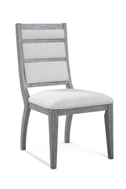 The Nylah Dining Chair has a modern glam styling with gray oak veneers in a platinum finish. Features a high upholstered back that alternates plush fabric channeling and wood slats. The upholstered seat and back are in an off-white fabric.