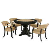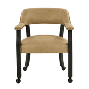 The Rylie Captain’s Chair effortlessly combines practicality and elegance. Outfitted with four independent casters, it offers unparalleled mobility, ideal for dining rooms, offices, or as a sophisticated addition to living spaces. Its solid wood legs guarantee both durability and stability. Wrapped in fade-resistant sand vegan leather and adorned with copper nailhead trim, this chair radiates lasting beauty. The smoky, black finish offers a beautiful contrast to the sand colored vegan leather in a sultry and sophisticated game or dining chair.