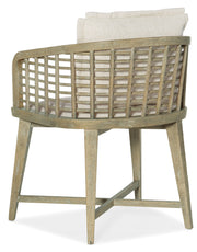 Create a calming resort-inspired retreat in your home with the laid-back Sundance Barrel Back Chair. The appealing lattice design of the cane seat back combines with a loose back pillow and an upholstered seat covered in the Zuri Cream performance fabric to invite you to linger and relax. The legs, arms and X-style stretcher are finished in the light natural Driftwood finish with distressing including sandblasting and bleaching.