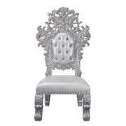 See the extravagant style and classical design all over the Valkyrie Dining Room Collection. Bold, intricate scrollwork accent is highlighted throughout each piece in this collection. Antique Platinum Finish paired with muted gray tone brings attention to its gorgeous details. Rectangular dining table showcases a timeless pedestal-style silhouette while matching chairs feature button-tufted upholstery for lavish comfort. Bring a dramatic change to your home with the Valkyrie Dining Room Collection.