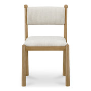 Gillian Segal for Moe's The Villetta dining chair echoes timeless allure. Showcasing classic stripes, each curve tells a story of heritage and finesse. Its warm, stained frame and whimsical finial touches draw inspiration from the vintage elegance of the '60s and '70s.