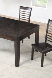 The comfortable, contemporary design of the Ally Dining Table welcomes everyone to your home. The table top features a beautiful fancy face veneer layup, a double-top design and an 18" locking leaf when extra guests are coming. The top is supported by sturdy, chamfered legs all in a finish. This chair features a contemporary ladderback design with a dark polyurethane upholstered seat for added comfort and cleanability. Set includes dining table and 4 side chairs.