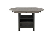 This counter-height dining group embodies a chic, contemporary style with its sleek design and elegant finishes. The ensemble features a robust, round table with a striking wood veneer top that showcases the natural grain, adding a warm, organic touch to the modern silhouette. The table is thoughtfully designed with an integrated turntable, drop leaves and built-in shelving, providing a convenient storage solution for dining essentials. Surrounding the table are high-back chairs, upholstered in a textured, light fabric that contrasts beautifully with their dark wooden frames, offering comfort and sophistication.