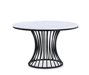 This dining set is a sophisticated blend of contemporary design and artistic flair, ideal for modern homes seeking a touch of elegance. The set features a sleek, round table with a faux marble top that is both beautiful and easy to care for. The table's base is a sculptural marvel, with a dynamic, cage-like structure that is as sturdy as it is stylish. Accompanying the table are plush chairs upholstered in a high-quality, textured fabric, their high backs and cushioned seats offering utmost comfort. The chairs' bold frames contrast with the light upholstery, adding a striking visual interest to the set.
