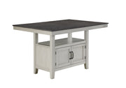 Relaxed, transitional styling in a neutral two-tone milk and finish are the hallmarks of the comfortable Hyland Counter Dining Set. A Storage Counter Table anchors any dining area ably with a 20-inch insertable leaf to expand to 80-inches for seating of up to eight. The finish marries up with the oil-rubbed nickel hardware and vegan rawhide upholstered chair to create a fresh yet approachable dining set you will treasure for years.