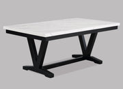 Introducing a harmonious blend of modern sophistication and classic elegance. This dining set showcases a refined faux marble tabletop supported by a distinctively designed trestle base, creating a striking contrast. Accompanied by sleek chairs, accented with nailhead trim and dressed in a chic leatherette upholstery, this ensemble is a testament to understated luxury. The additional bench seating option promotes communal dining and adds versatility.