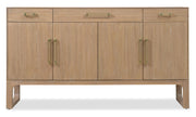 The Banyon Bay Buffet combines ample storage with modern design. Featuring four doors with adjustable shelves behind each pair, three drawers, and a silverware tray, this buffet provides plenty of space for dining essentials. The Egyptian marble top adds a touch of luxury, while the brushed brass hardware and Desert Oak finish create a cohesive, contemporary look. This piece is ideal for dining rooms looking for both function and style.