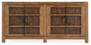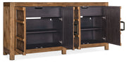 Warm and rustic with a silhouette that evokes the weight, heft and heritage of beam construction, the Big Sky Buffett is crafted of Pecky Hickory Veneers with a solid wood edged top. The buffet is finished in Vintage Natural, an organic finish that reveals the authentic knots and wood grain patterns. The four doors have soft-close hinges, and there’s one self-closing drawer and one adjustable shelf behind each pair of doors. The right side drawer has a removable felt liner and the left side drawer has a removable silverware tray. The interior is finished in Charred Timber, inspired by the restorative beauty of a fire-ravaged forest.