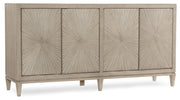 With the stunning textured starburst pattern on the doors, you will want to show off the Elixir Buffet throughout your home. Use it in the hall as an entry piece, in the dining room as a buffet, or use this TV-ready piece in the family room as an entertainment center or console. The 4 doors have touch latches, and there are 2 drawers and 2 adjustable shelves behind each set of doors. Ventilated back panel. Accommodates up to 70-inch flat screen TV.