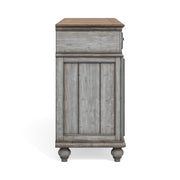 Entertain in relaxed cottage style with everything you need to host dinner guests with this Plymouth buffet. A weathered graywash finish is accented by a medium brown top and gunmetal pulls, while paneled details and turned bun feet add to the cozy vintage character. This buffet features two cabinet spaces with adjustable shelves and a removable wine rack that can store up to 16 bottles. Pair that with six spacious drawers—complete with felt-lined top drawers and a removable silverware tray—and you have ample storage for serving pieces and other dining essentials. Each drawer features ball-bearing glides for smooth access and support for heavy dining ware.