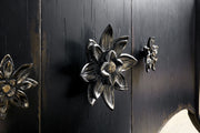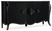Absolutely captivating, the Bien Ame Buffet is a luxurious piece that is approachable and inviting. With classic bones, the 3-door buffet features a shaped apron and cabriole legs and delightful decorative floral hardware. Crafted of Poplar and Hardwood Solids with Oak Veneers, it is finished in Porte Noir, a black paint with rich brown undertones with areas of heavy rub through and distressing to reveal a honey tone wood color. Doors have soft-close hinges, and there is one adjustable shelf behind each door.