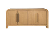 The Chandler Sideboard is crafted with solid wood and flat-cut oak veneers in a light oak finish. Its modern design boasts smooth, rounded edges and step-molding detailing. The four doors feature oversized antique brass handles, concealing adjustable shelves with media cord management. Finished in white oak with antique brass accents, it embraces natural wood grain variations.
