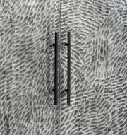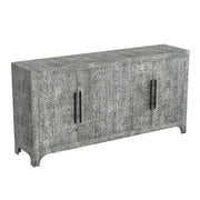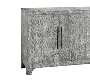 The Clancy Server combines rustic style with a modern bohemian flair. Features hand carved scoop detailing throughout the cabinet, and long iron bar pulls finished in matte black. Behind the four doors are two cabinet areas, each featuring an adjustable shelf and media cord management. The solid mango wood server has a rustic, textured finish in a gray wash.