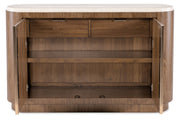 Crafted for the design-savvy host, the Eleana Server combines Light Caramel walnut veneers, Sunlit Bronze hardware, and a honed marble top for a look of modern luxury. Featuring two self-closing drawers, adjustable shelving, and a drop-in silverware tray, this piece is ideal for both storage and display, making it the perfect companion for elegant entertaining.