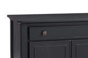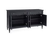 The Hudson Server features an all black finish, with geometric details giving it an Asian flair. This sideboard provides ample storage between the two upper drawers and two cabinets. The top drawers feature black felt lining. The four doors open smoothly with the magnetic stops and soft close hinges, revealing two cabinet spaces, each with an adjustable shelf. The sturdy piece is solidified with adjustable floor levelers on each leg.