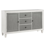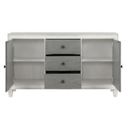 Add much-needed storage to your dining area with the Katia server. This server features three ample drawers and two side cabinets with a shelf on each side, perfect for all your extra dishware, glassware, and linens. The drawers and cabinet doors showcase gray fronts for a contrast to the weathered white finish of the outer frame. Metal hardware and wooden legs complete the piece. The piece sits on eight beautifully crafted fluted wooden legs.
