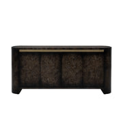 The Langford Server is expertly crafted from solid wood, showcasing beautifully selected olive-ash burl veneers finished in a rich opaque black stain that highlights the wood's natural beauty. Its clean lines and rounded end panels create a bold, modern statement. Behind the four doors, you'll find adjustable shelves for versatile storage and convenient media cord management. This piece seamlessly combines style with functionality, making it a perfect addition to any dining or entertainment space. Elevate your decor with the sophisticated design of the Langford Server.