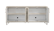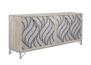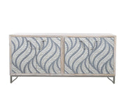 The Leia Server is a stunning modern piece, featuring a solid mango wood case frame finished in a light bleached tone. Its intricately patterned door fronts showcase hand-laid bone and light grey resin, reflecting exceptional craftsmanship. Custom iron hardware adds a touch of sophistication, while the cool pewter-finished base enhances its contemporary appeal. This server embodies bespoke design, making it a standout addition to any dining space. With its unique aesthetic, the Leia Server combines style and functionality effortlessly.