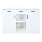 The white high gloss finish of the Paxley server creates a sleek and polished appearance that adds a touch of modern elegance to any room. The glossy surface not only enhances the server's visual appeal but also makes it easy to clean and maintain. The three drawers offer convenient storage for your dining essentials, such as cutlery, napkins, or small serving utensils. The drawers provide a clutter-free solution, keeping your dining area organized and tidy. The wine rack is a standout feature of this server, offering a dedicated space to store and display your favorite bottles of wine. It allows you to keep your wine collection within reach, ready to be enjoyed during meals or special occasions. The two cabinet spaces provide additional storage options for larger items, such as serving platters, table linens, or dinnerware. These cabinets offer concealed storage, allowing you to keep your dining area neat and organized. An open shelf is included, providing a versatile space for displaying decorative items or storing frequently used dining accessories. It offers a perfect opportunity to showcase your style and add a touch of personality to the server.