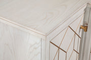 Meet the Perrine White Server, a fine example of modern glam design. With its four doors featuring a geometric carved design highlighted by a gold finish, it showcases a blend of artistry and functionality. Inside, you'll discover two shelves behind each door, and the center provides a convenient drawer and shelf. The soft white finish, satin brass accents, and clear acrylic elements make it a distinctive addition to your home. The Perrine White Server combines style and practicality to enhance your decor.